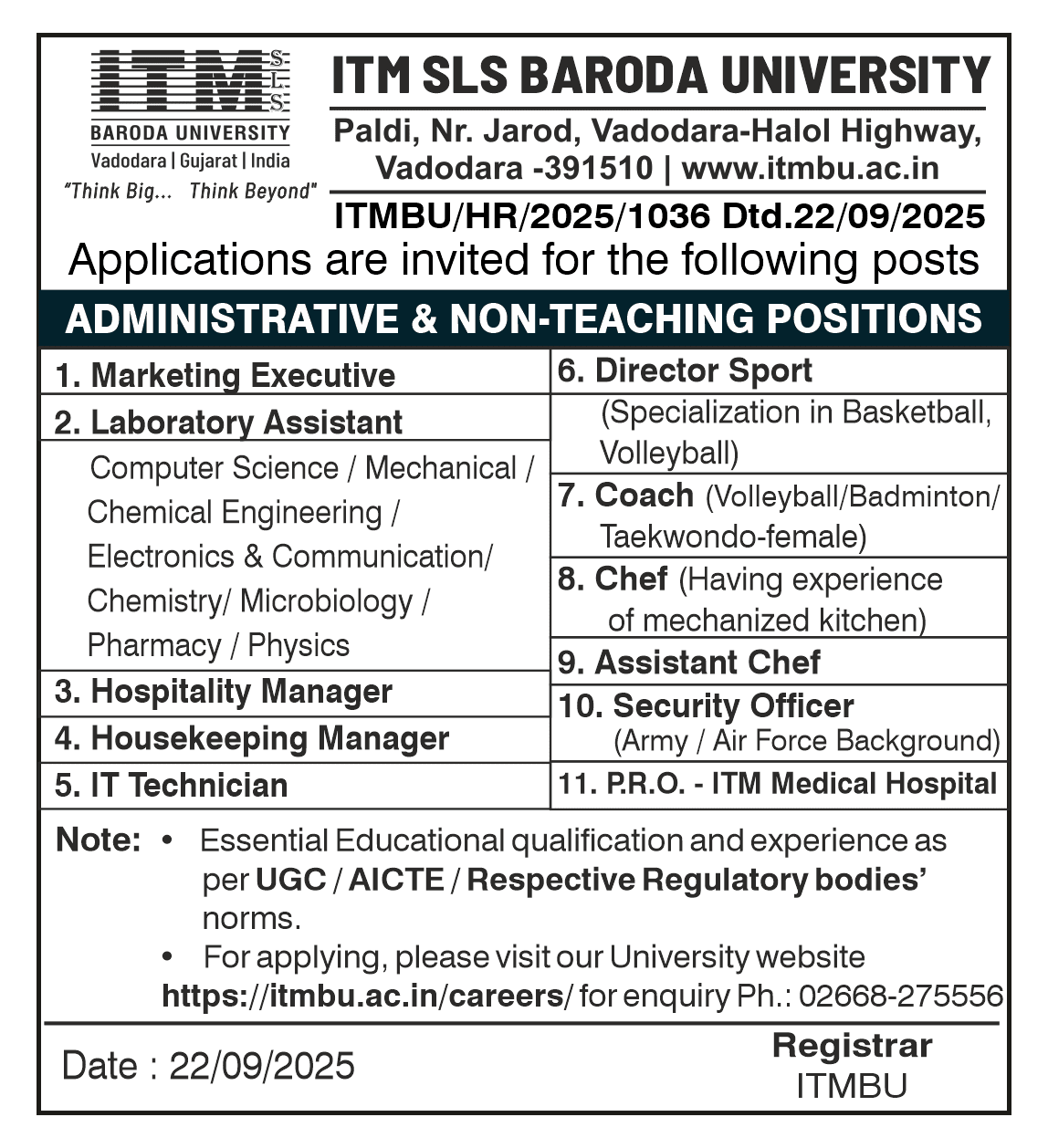 Essential Educational qualification and experience as per UGC / AICTE / INC / respective regulatory bodies norms & ITM(SLS) Baroda University rules